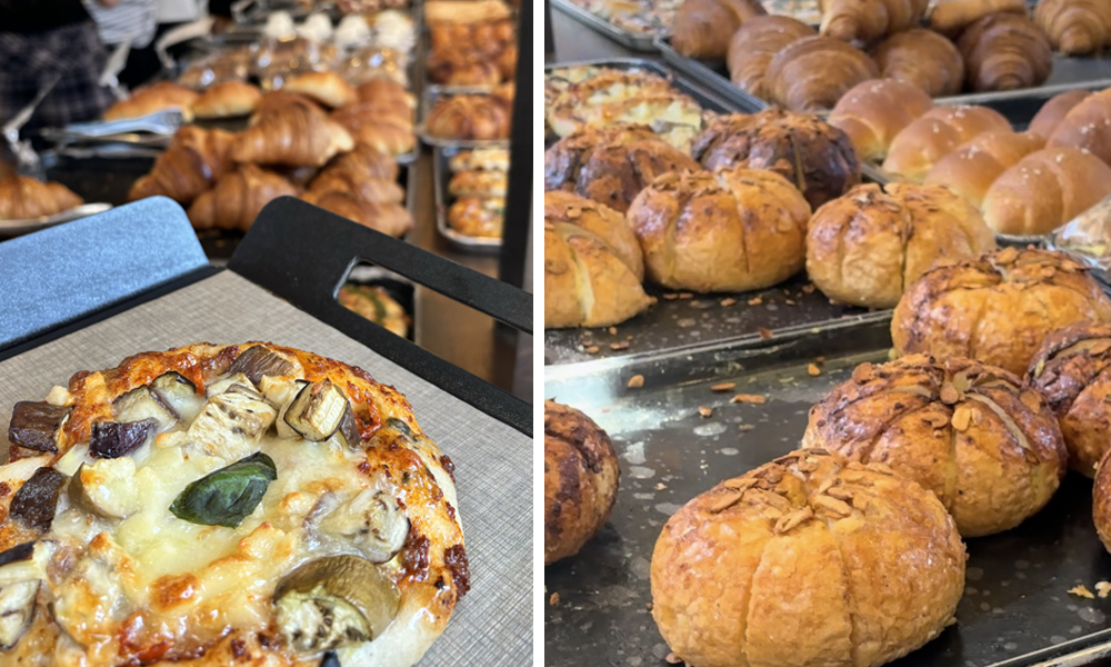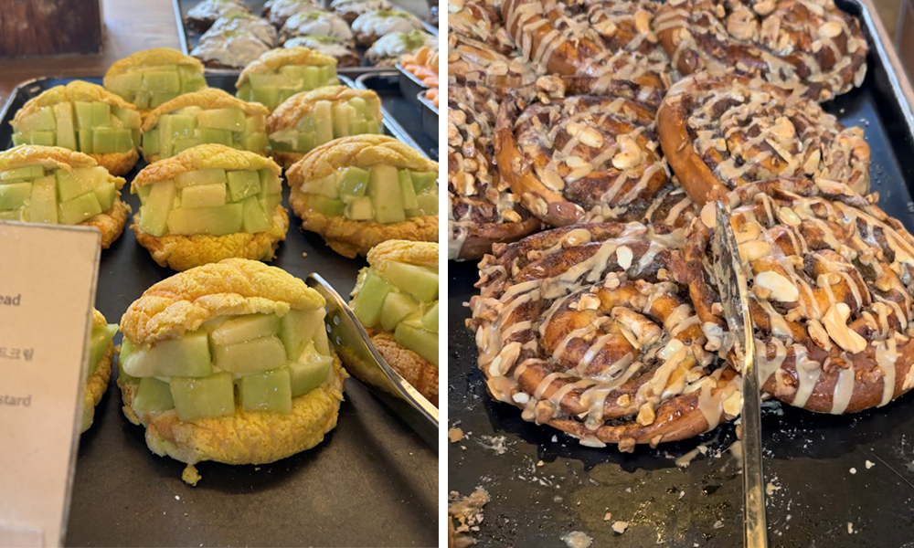 Yo elegí un croissant XL relleno de higos y crema de mascarpone y una bebida fresquita de frambuesa. Y mi amigo una pizza de verduras y un Ice Americano. El total fueron 76.000 wones (barato no es).