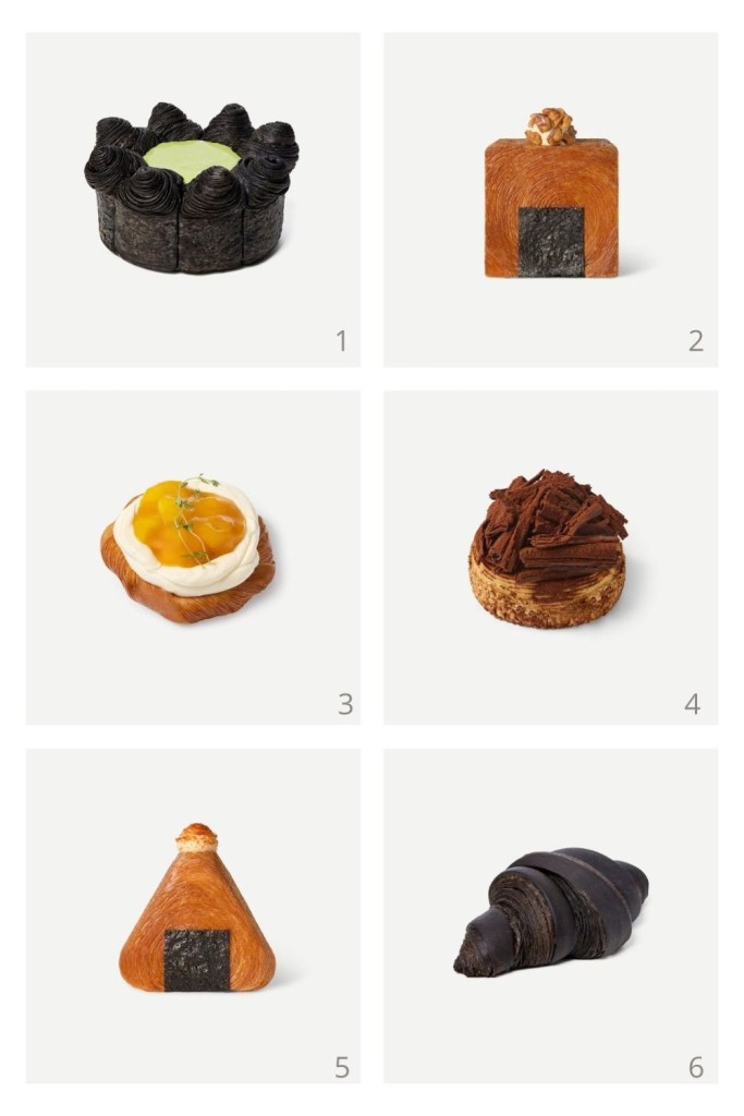 1 – Pastel pequeño de pico, relleno de rica crema de matcha y rodeado de masa de tinta de calamar