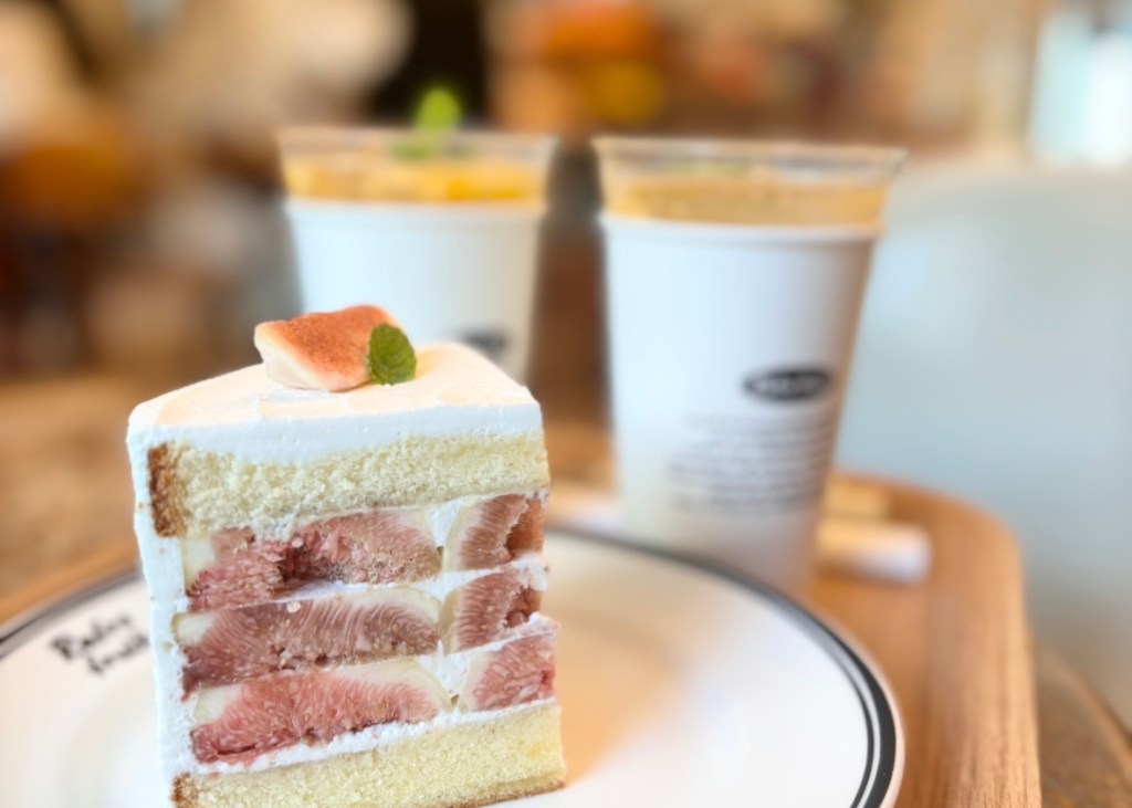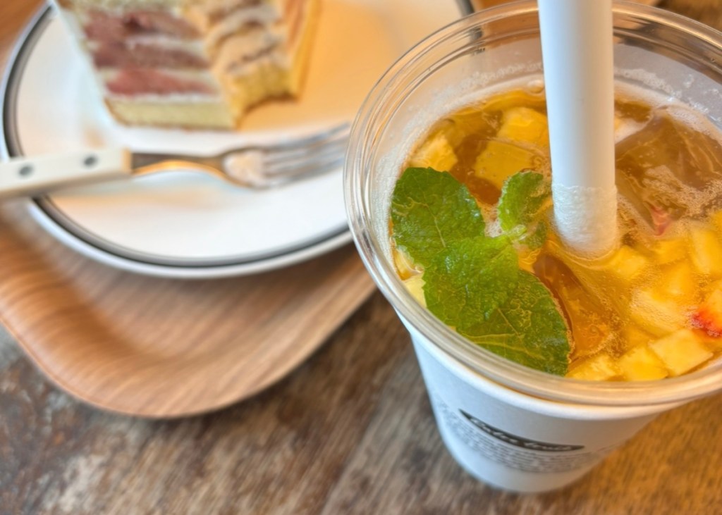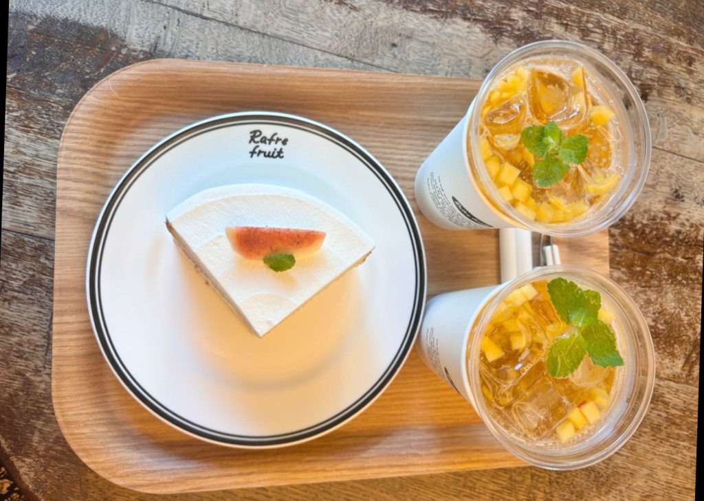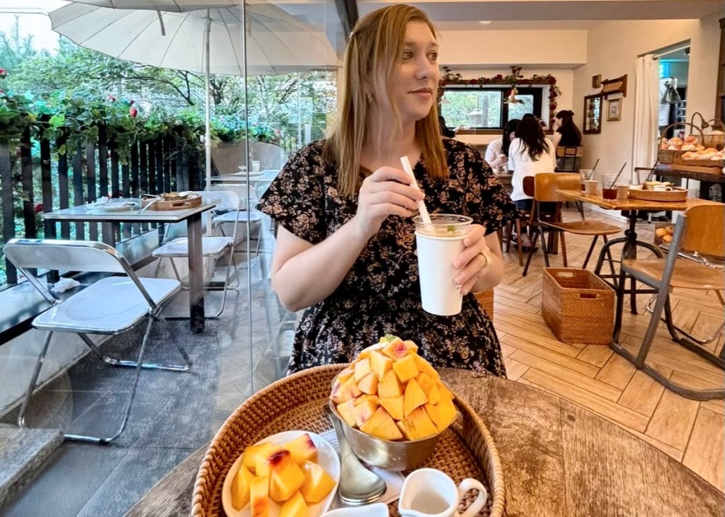 Elegimos el pastel de higos (¡no puedo describir lo bueno que estaba!) y el refresco de melocotón. Y, por supuesto, tuve que probar el Bingsu de melocotón, estaba simplemente increíble! Lo servían acompañado de leche condensada, más melocotón fresco y un poco de pasta de judías negras dulce (en referencia al sabor clásico).