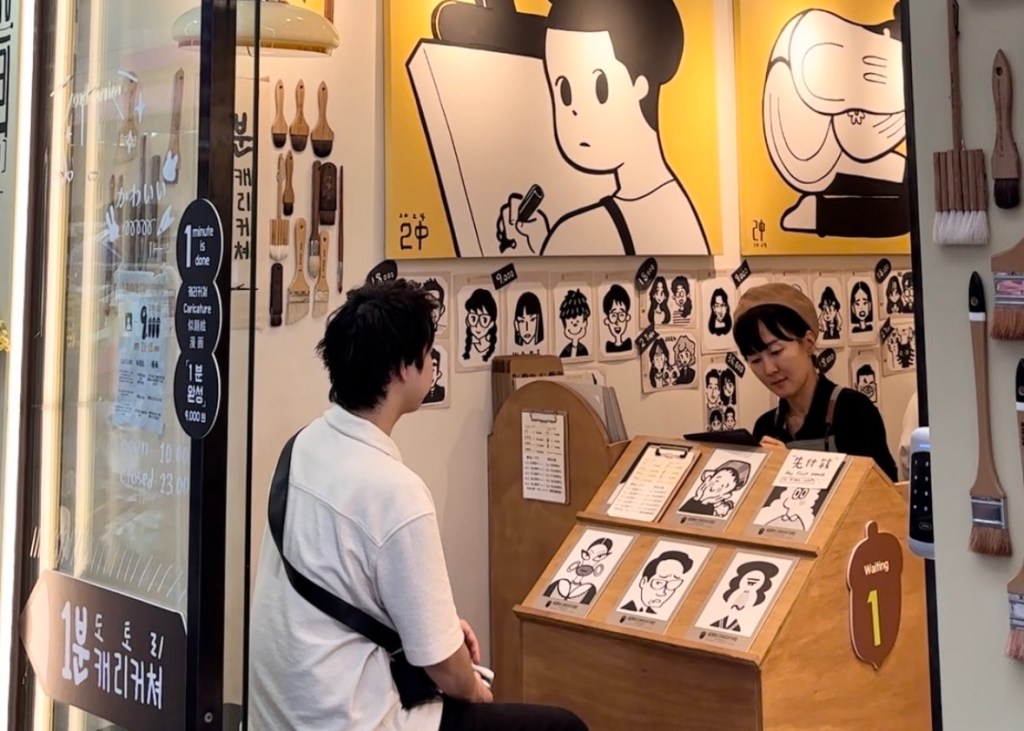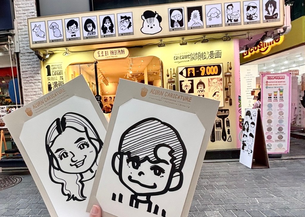 ESP – Si estás en Seúl y buscas un recuerdo bonito para llevar a casa, olvídate de imanes de nevera o abrebotellas y compra algo diferente, como esta caricatura de Acorn Caricature, se hace en solo 5 minutos! Debo admitir que al principio me dio un poco de vergüenza, ya que este sitio atrae a mucha gente que se para a mirar… pero lo bueno es que no conozco a nadie allí, así que decidí no preocuparme!