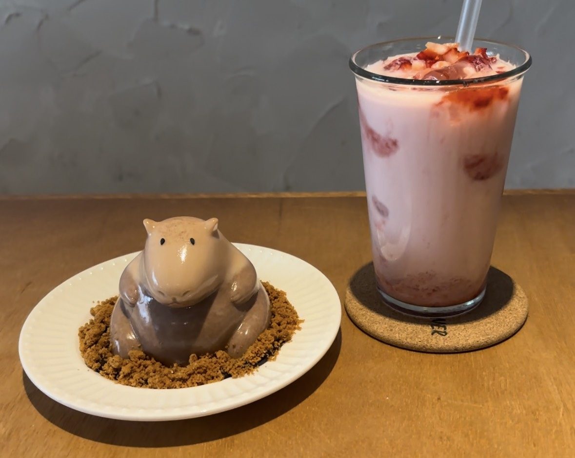 ENG – It was raining a lot in Seoul today, so I went to a café famous for its creative desserts. I tried the Capybara pudding — not only was it super cute, but it was also really delicious!