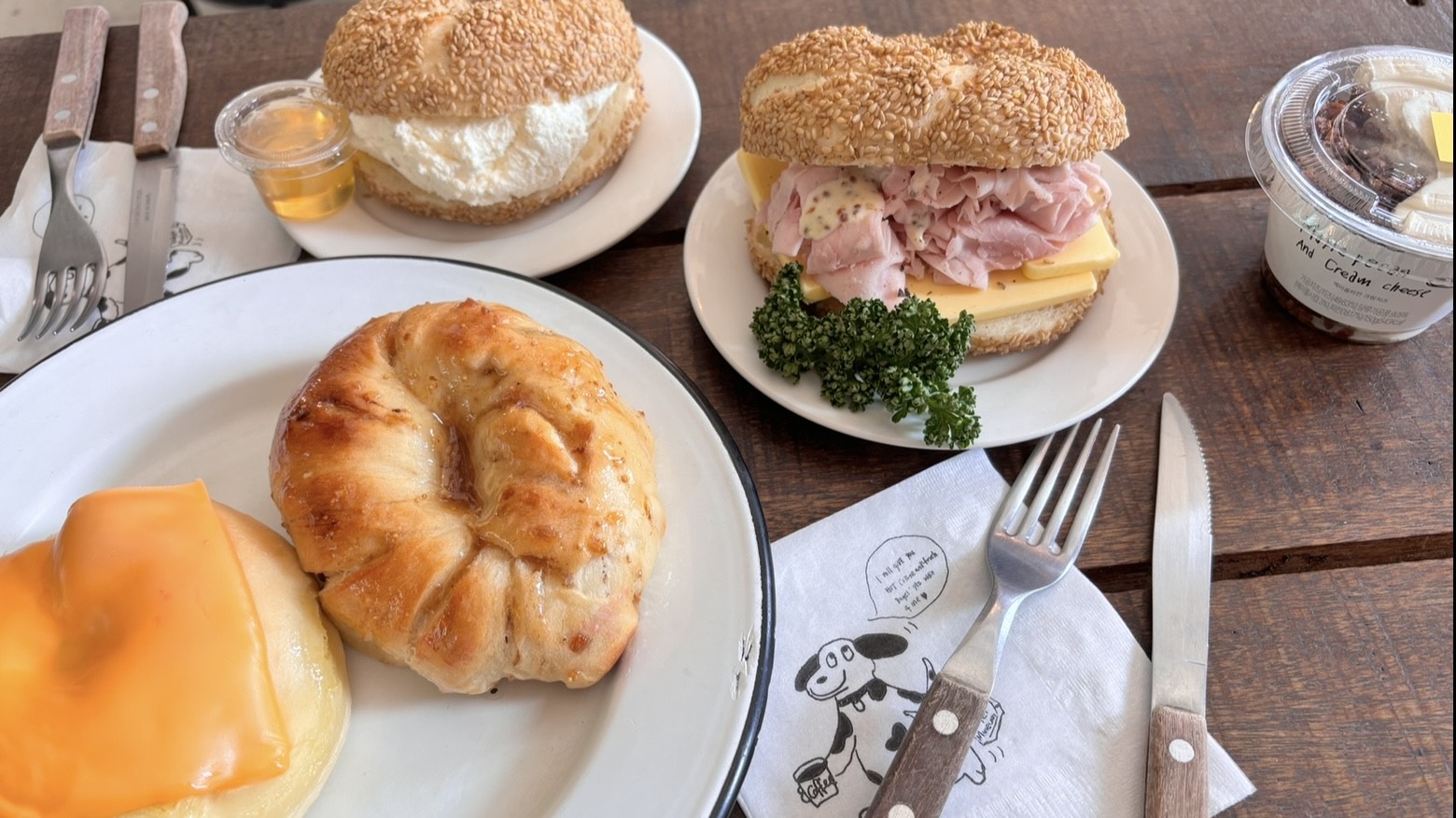 – When you arrive, first find a seat. You can leave your bag, phone, or whatever you want to mark your spot (don’t worry, no one will touch it!). Then, you go choose your bagels, sauces, and drinks.