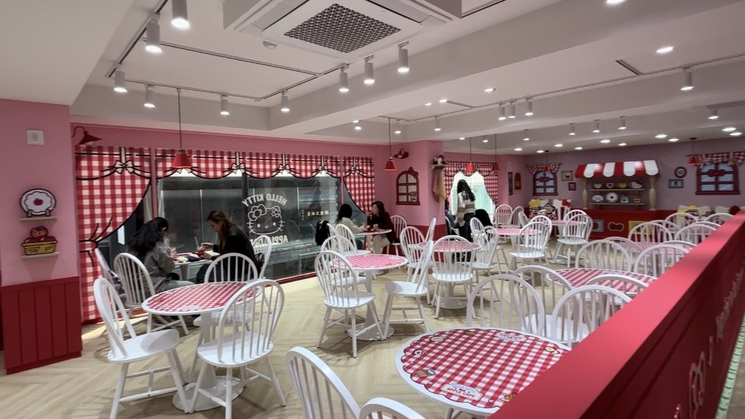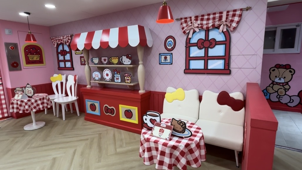 La cafetería está decorada con todo el encanto y el estilo kawaii que caracteriza a Hello Kitty, cuidando hasta el más mínimo detalle. En la planta baja y la segunda planta se encuentra la zona de cafetería y una zona perfecta para hacer fotos, con rincones temáticos y decoraciones llenas de corazones, manzanas y, por supuesto, mucho rojo y rosa.