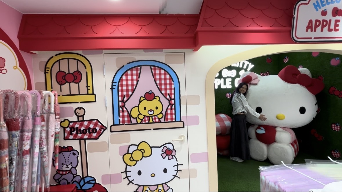 En la tercera planta hay una tienda llena de productos exclusivos y, lo mejor de todo, una Hello Kitty gigante donde puedes hacerte fotos. ¡Obviamente no me resistí y aproveché para llevarme mi foto de recuerdo! 📸