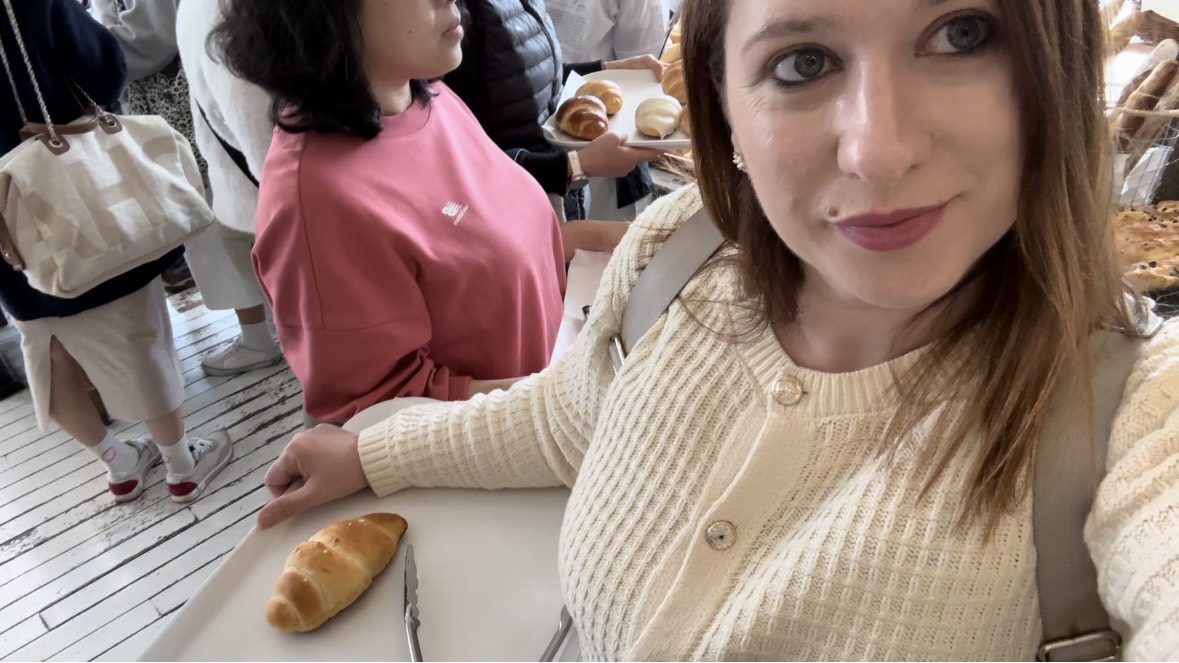 The first thing that caught my attention was the line: yes, there are quite a few people waiting to get in. But the system is well organized: you approach a machine to register for the online queue before entering the café, and depending on which area you want to sit in or how many people are in your group, the wait will be shorter or longer. There’s also an option to order takeout. I wanted to sit on the terrace, and since I was alone, I waited 30 minutes. Some people, however, had to wait for hours.