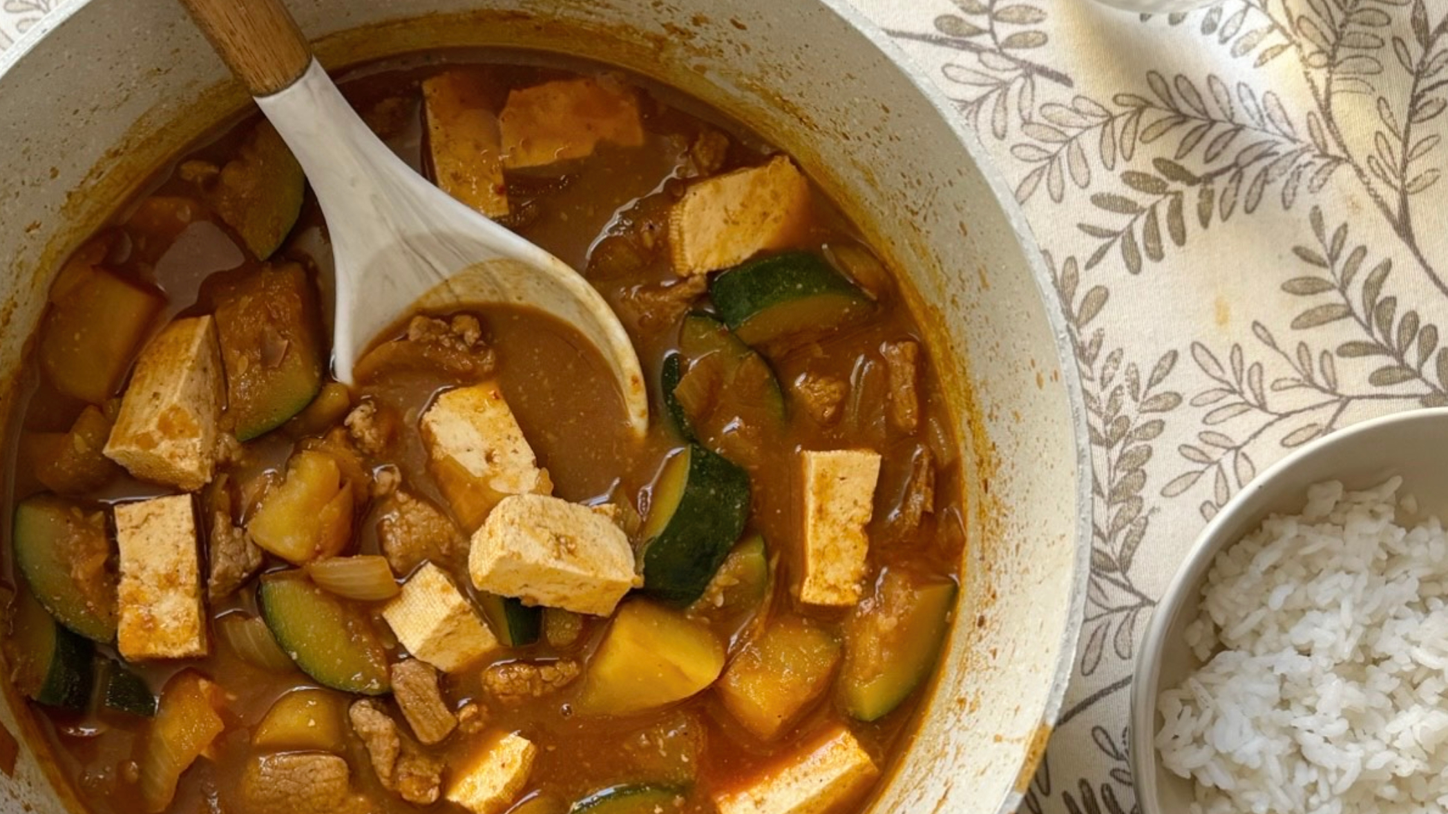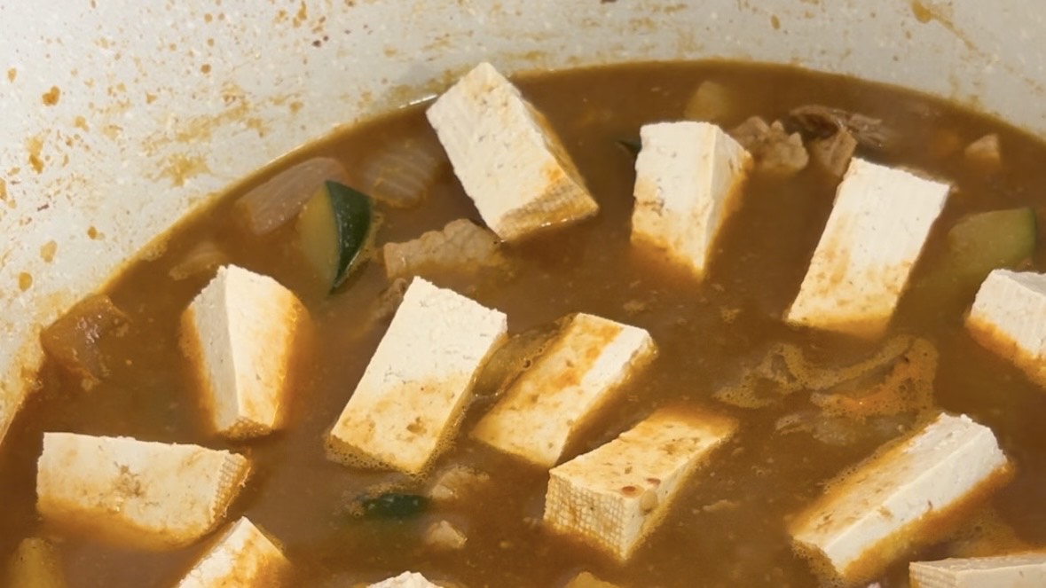 5. Añade el tofu y cocina 5 minutos más. Prueba el caldo. El agua de arroz suaviza mucho el sabor, así que puedes añadir un poco más de 된장 si lo quieres más intenso.